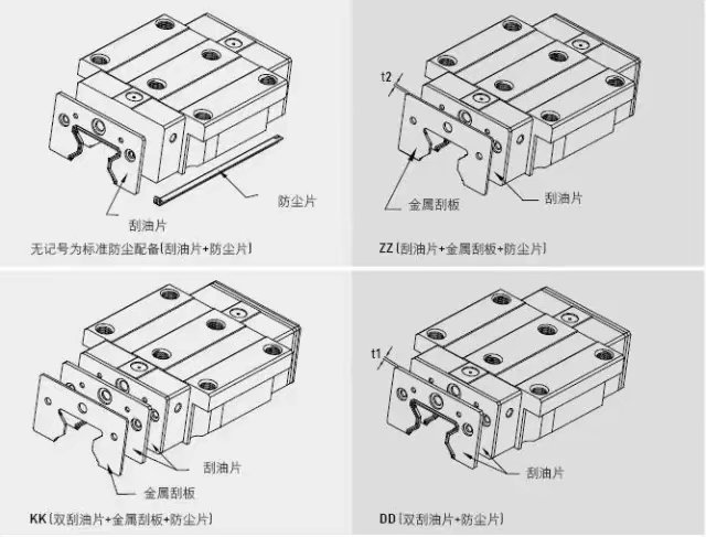 1.刮油片及底部防塵主要阻止鐵屑或粉塵顆粒進(jìn)入滑塊,破壞珠道表面而降低線軌使用壽命;